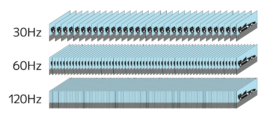 要するに、紙芝居を1秒間に60枚の絵で表示するか、120枚の絵で表示するかみたいな違いで、当然1秒間に120枚表示される紙芝居のほうが滑らかに視認することができるわけです。