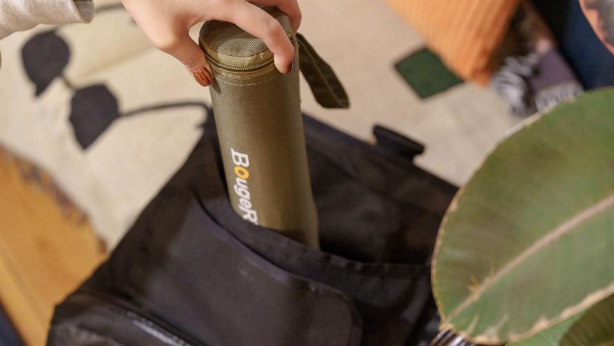 個人的に感動したのは、出力のわりにコンパクトで軽いところです。約0.99kgで、専用の保護袋ごとバッグに入れて持ち運べるほどのサイズ感。バックパックにもスッと収まります。