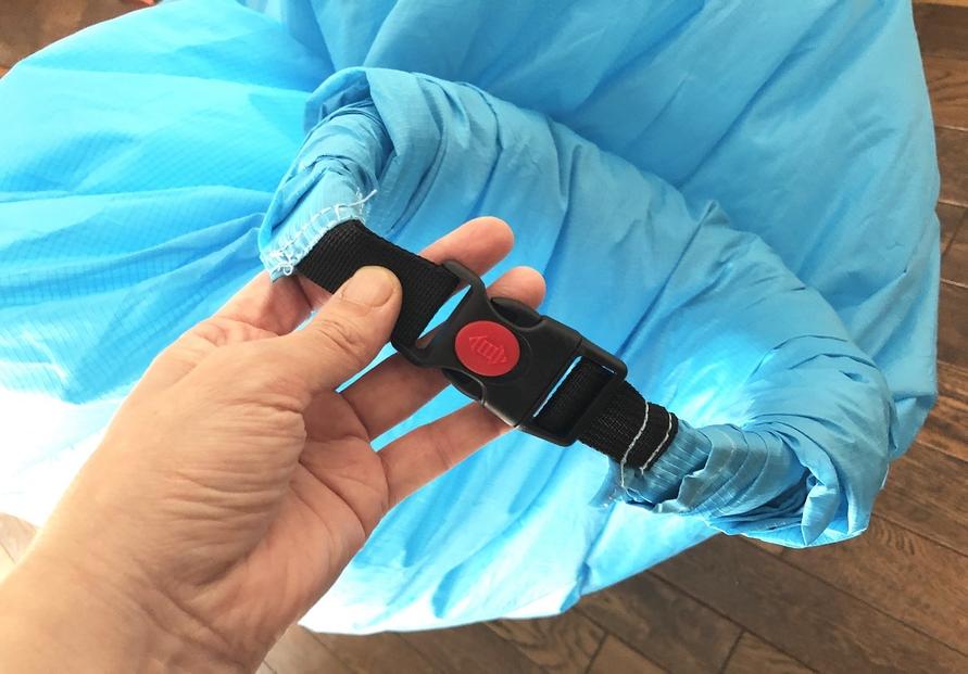 広げて空気を入れたら、袋状になっているソファがパンパンに張るようにしてバックルを留めます。