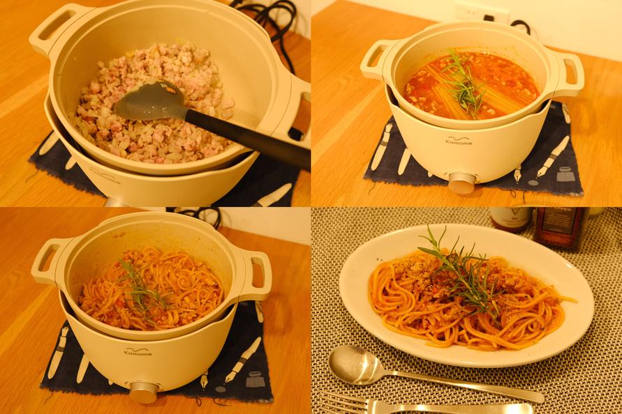 また、あまりの簡単さに驚いたのがパスタ。「ひと鍋ミートパスタ」はスパゲッティ以外の材料をすべてグリルパンに入れて混ぜ、スパゲッティを折って入れたら、加熱するだけ。