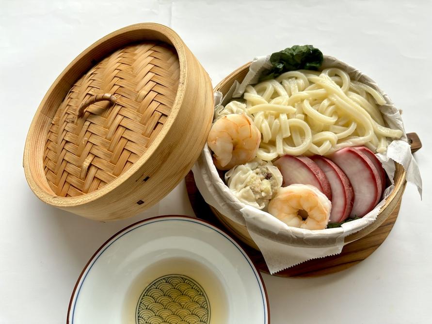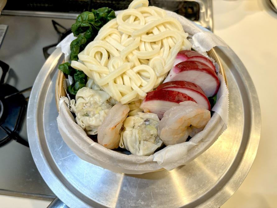 うどんはもっちり、海老はぷりっぷり、焼売はほっくり、かぶはジューシーに。それぞれの具材が最高の状態に蒸しあがりました!