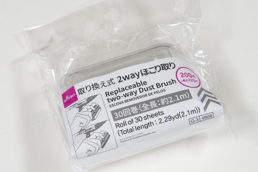 「取り換え式」という商品名の通り、粘着ローラーは30回巻き分使い切ったらダイソーで販売されている「ロール型ほこり取り(替えロール2本、5.8cm×2.3cm)」で交換可能。