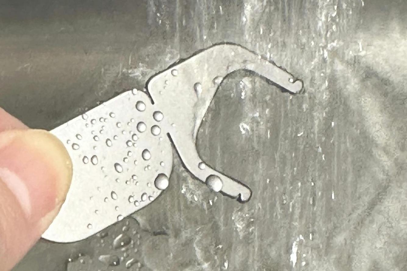 「チタン製フロスハンドル」の素材は、医療用にも使われる99%純チタン。金属特有の味やにおいがなく、サビにくいので、洗面台や浴室などの水回りに置いておいても衛生面は安心です。万が一傷がついても酸化被膜によって自然に保護され、長く使えるのもポイントです。