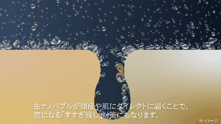 ナノバブルは毛穴や髪の毛よりも小さく、マイナスに帯電して隅々まで行き渡るので汚れ落ちアップなどに期待できるのが特長です。