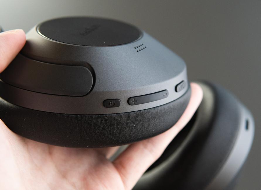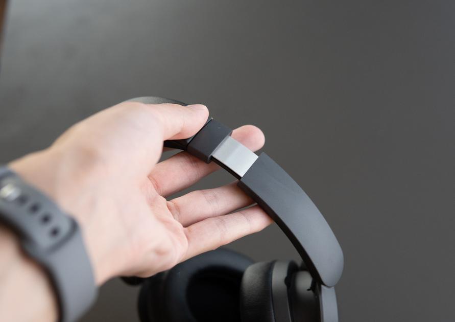 高価格なワイヤレスヘッドホンの場合、ボディやバンドにアルミやリアルレザーが使われることもありますが、こちらは全体的にプラスチック感強めで、主張強めなロゴの光沢感は価格相応といった印象。
