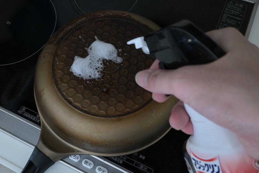 コゲ全体にスプレーしたら、程度に合わせて10〜60分ほど放置。