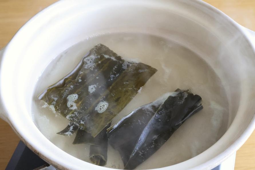 1. 鍋に水を入れて加熱し、鍋のスープを作る。昆布で出汁をとり(市販の出汁で代用可)、鶏ガラスープの素、醤油、みりん、おろしニンニクチューブ、おろしショウガチューブを入れて混ぜる。