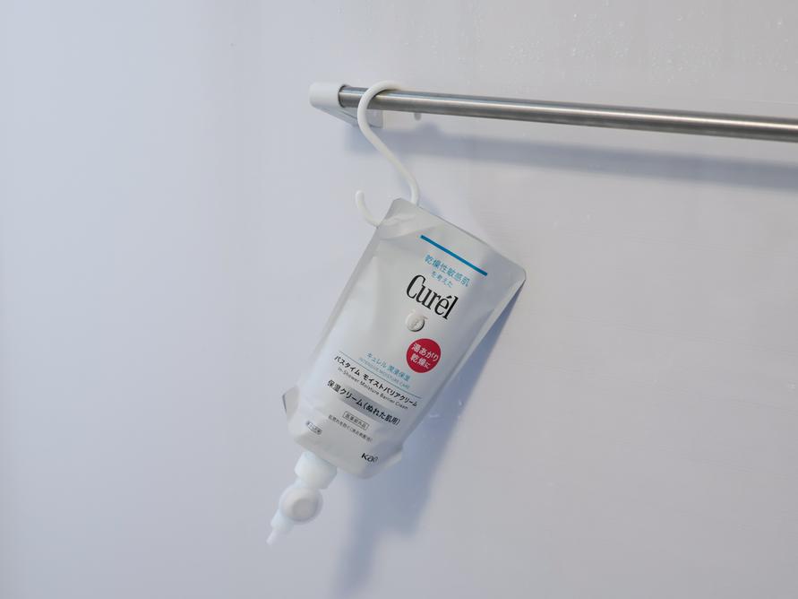 パッケージにボトルを吊り下げられる穴があいていて、付属のS字フックでタオルポールに掛けられます。