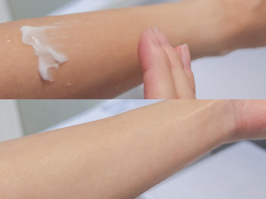 身体に塗り広げてみると、クリームが身体の水分となじんでローション状に変化します。