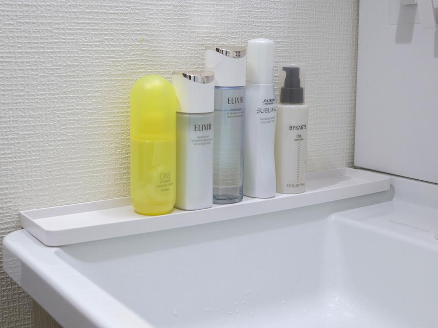 「洗面台横隙間トレー」は隙間を塞ぐだけでなく、うまくトレーも設置できるおかげで、ちょっとした小物の定位置になってくれたのでした。