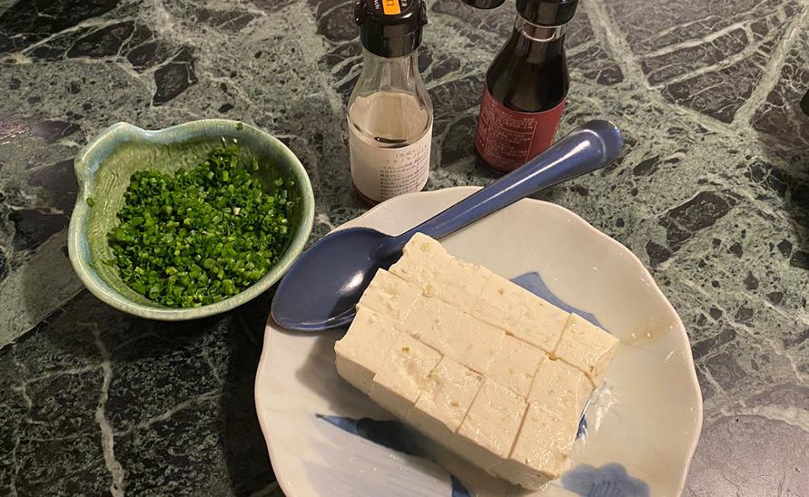 ふわっと絹豆腐(豆吉)にあさつきと生姜とお醤油。豆腐うまし!