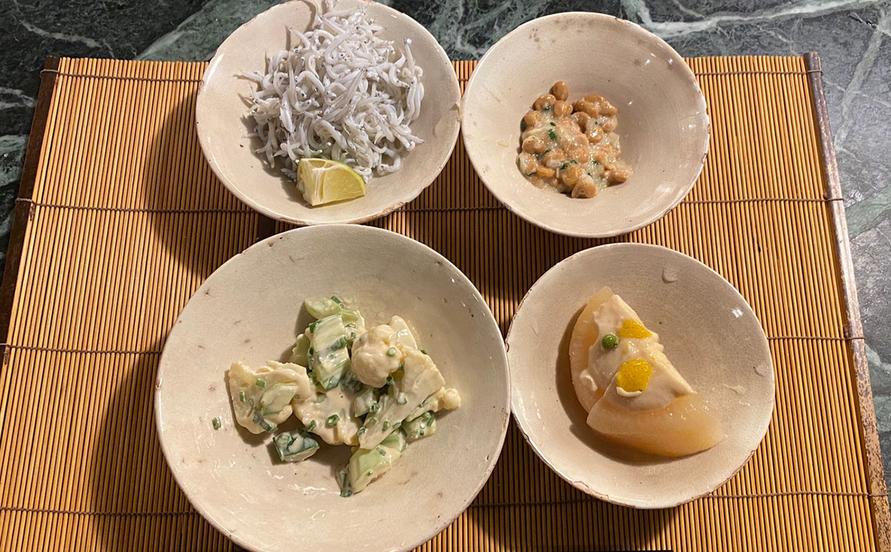 夜になってもあまり空腹にならず。カリフラワー(マヨネーズ)、しらす、納豆、ふろふき大根(1/2)。