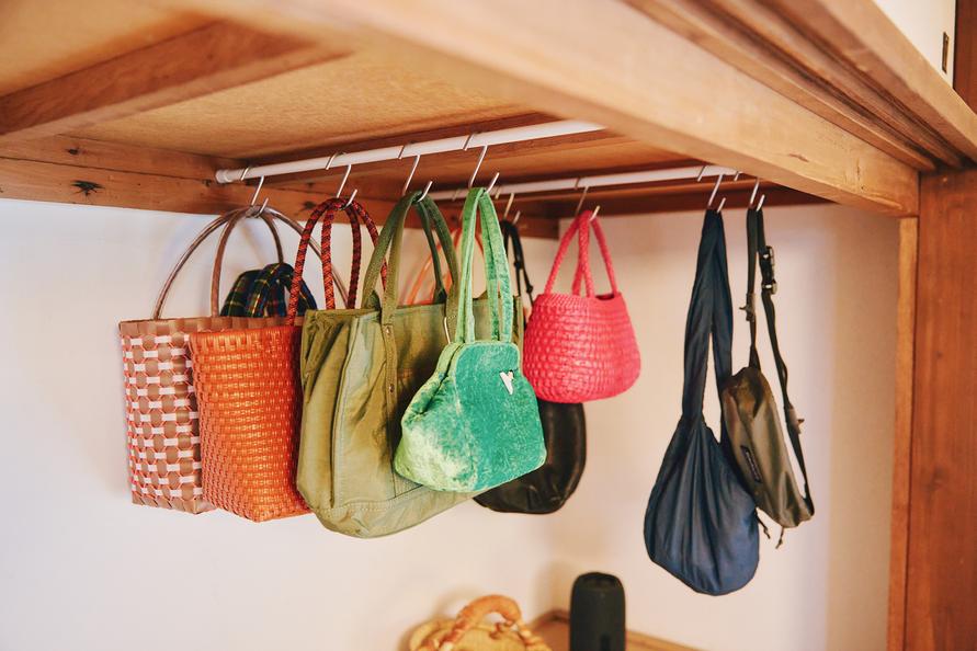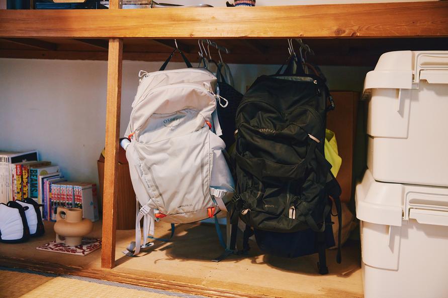 一方、普段は使わない登山用バッグやプライベートでよく使うカバンは、元アパレルスタッフらしい見せ方で収納されていました。