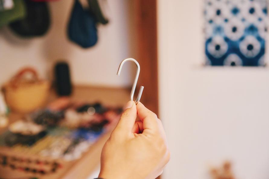 お店のようにバッグが正面を向く形で、きれいに並べられています。この並べ方を可能にしているのが、jinさんがダイソーで見つけた、アルミツイストS字フック。