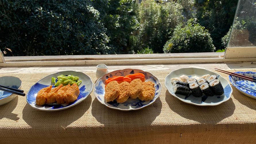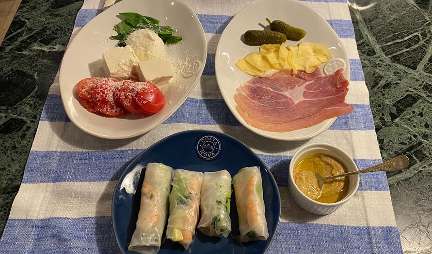 アボカドとエビの生春巻き(胡麻ソースで食べる)。トマトとブッラータと絹豆腐とバジル(パルミジャーノ、塩、胡椒、オリーブオイル:意外にも絹豆腐はカプレーゼの仲間としてNICE)、生ハム&チーズ&ピクルス。