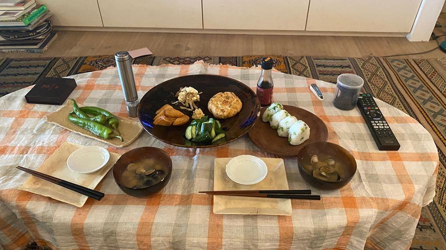 いぶりがっことKiri、さつま揚げ、がんもどき、焼き万願寺、菜めしのおにぎり、しじみの味噌汁。