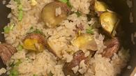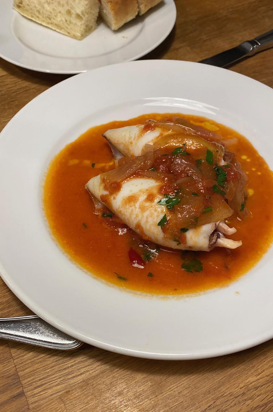 ヤリイカの舞茸&ライスの詰め物(farcie)を食べ、白ワインを飲む。
