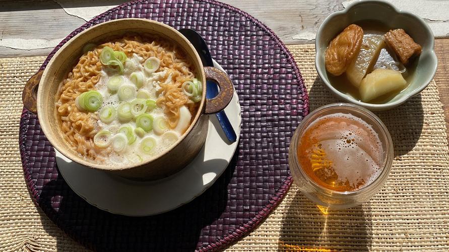 Nisshinのチキンラーメン、おでんの残り、ビール、どら焼き、ほうじ茶。