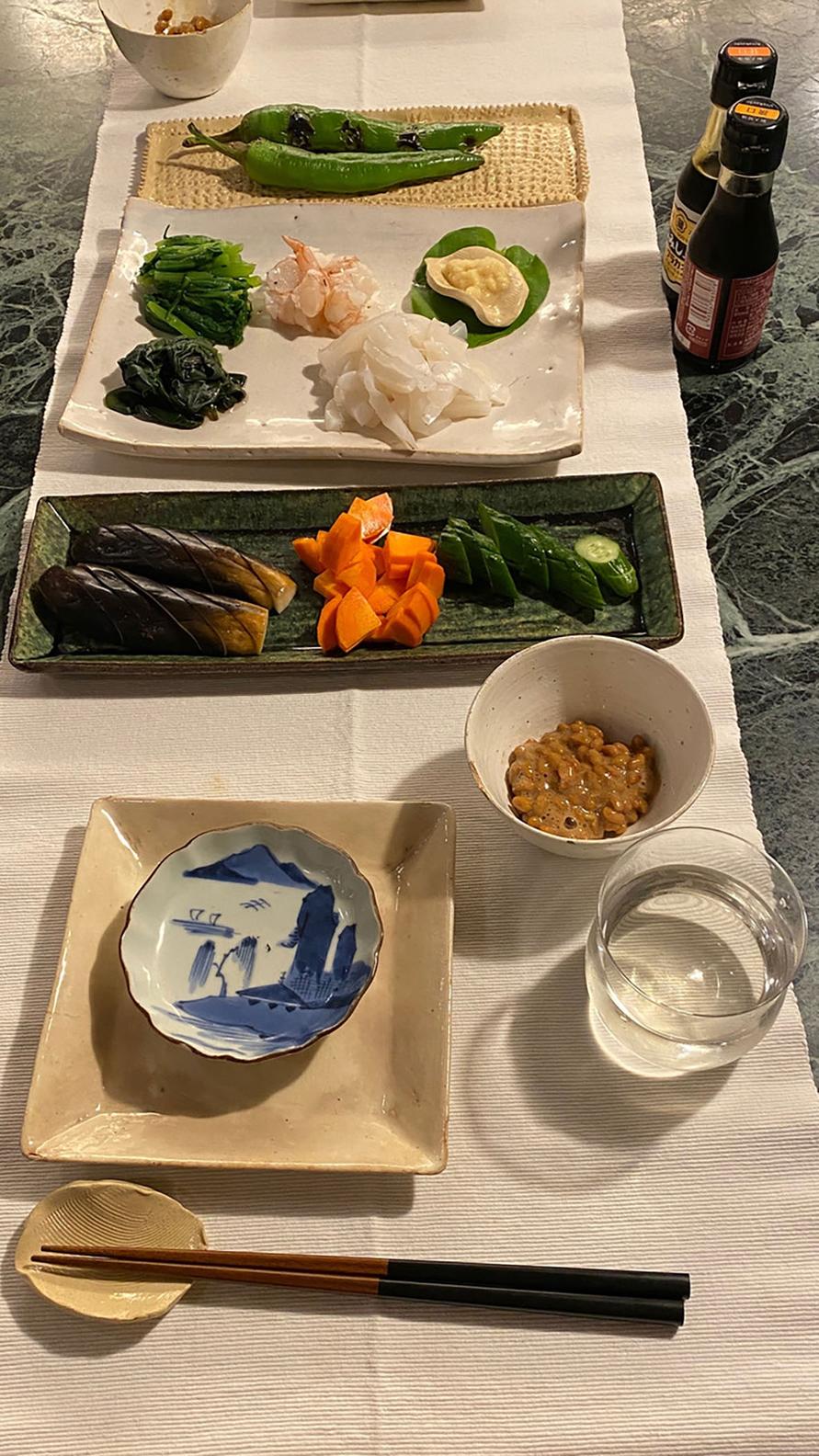 刺身(アオリイカ、赤海老、春菊、オカワカメ)、焼き万願寺、ぬか漬け(ナス、人参、キュウリ)、納豆、
