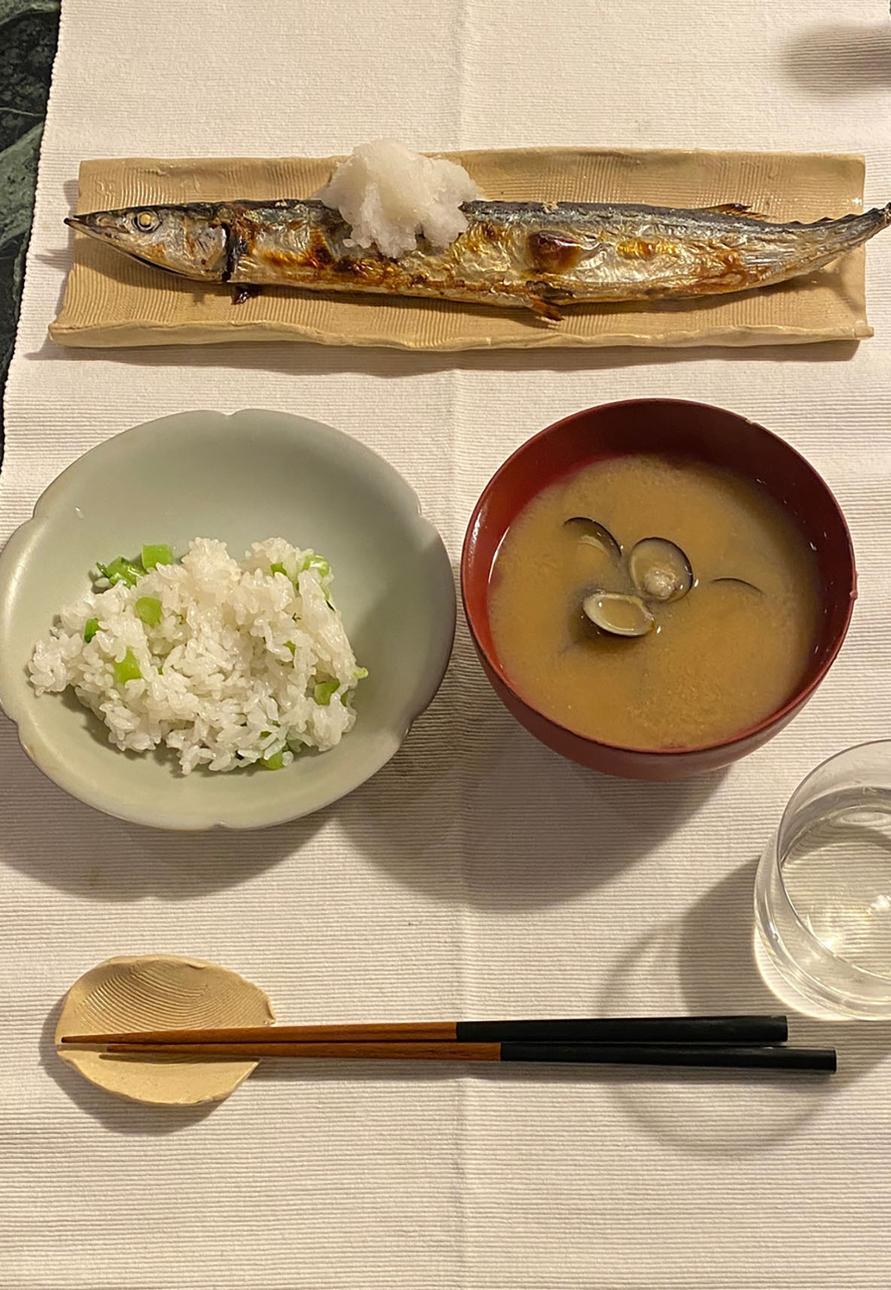 秋刀魚の塩焼き、菜めし、しじみの味噌汁。