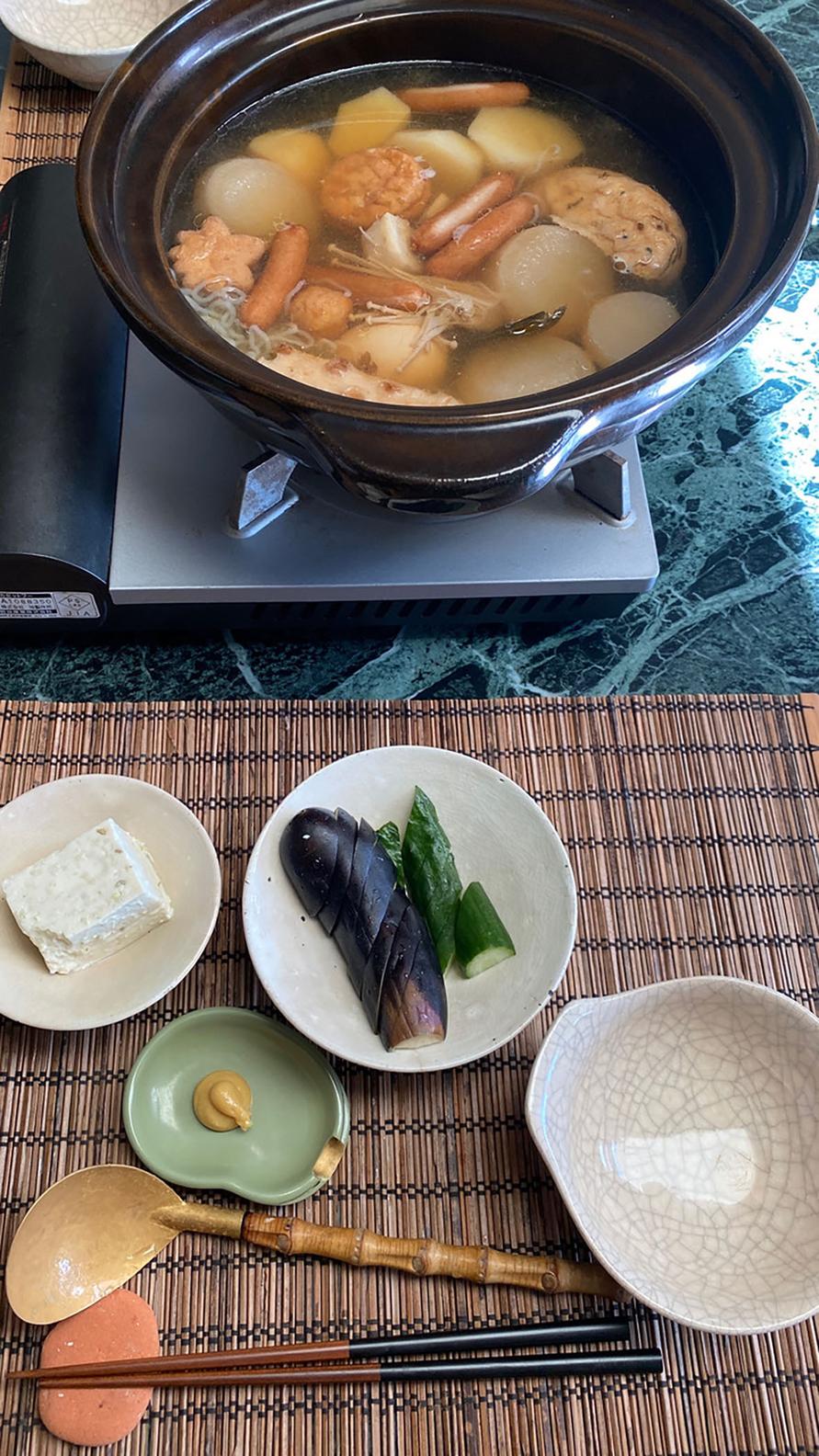 おでんの残り(昨夜の)、だだちゃ豆冨、ぬか漬け(ナスとキュウリ)、