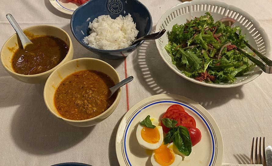 Erick South(またもや登場):青唐辛子ビーフカレー、キーマカレー、白ご飯、半熟卵、フリルレタス+コンビーフ。