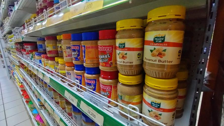 ウガンダでは肉や野菜とピーナッツソースを合わせた煮込み料理が人気。首都カンパラのスーパーマーケットには多種多様なナッツソースがずらり