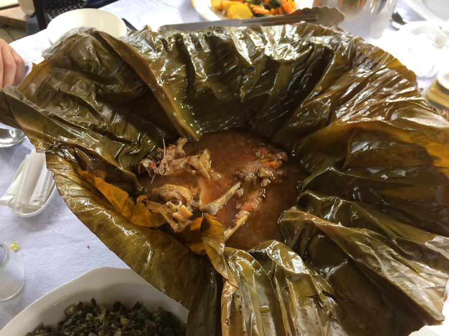 鶏肉や野菜、ピーナッツソースなどをバナナの葉で包んで蒸すウガンダの伝統料理「ルウォンボ」。柔らかなお肉と独特の香り、そしてナッツの風味が特徴です