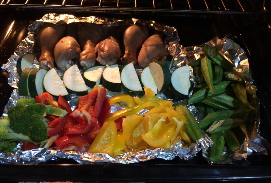 ニンジンやジャガイモ、玉ねぎなどの野菜もオススメ。今回は、あらかじめ塩コショウをふっておいた骨つきチキンも一緒に焼きました。