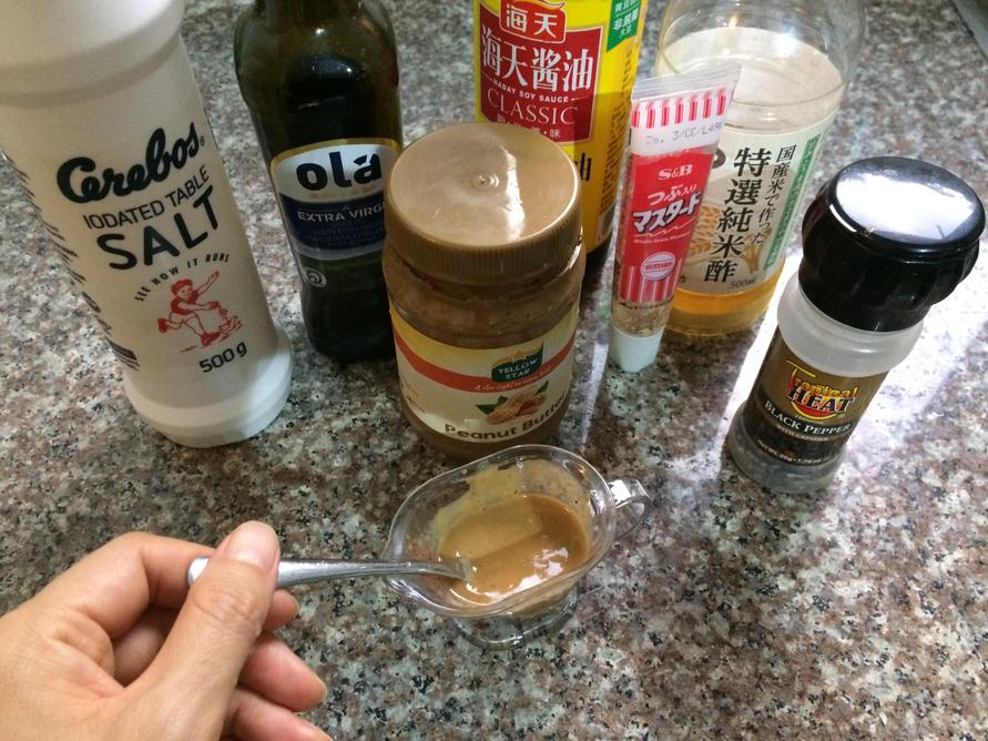 主役は無糖ピーナッツバター。オリーブオイルと醤油、酢、粒マスタード、塩、こしょうを、滑らかになるまで混ぜ合わせます。