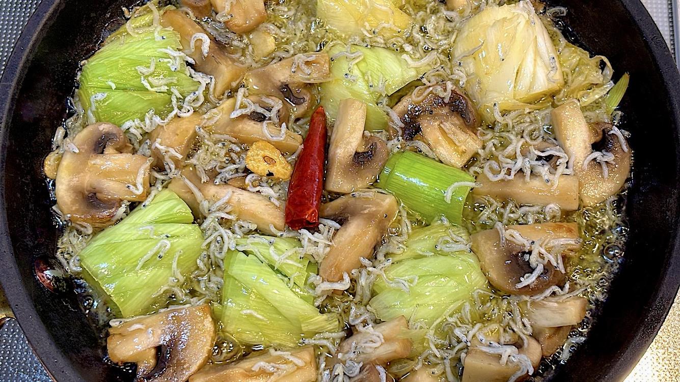 4. オイルがふつふつとしてにんにくの香りが出てきたら、長ねぎとマッシュルーム、ちりめんじゃこを加える。長ねぎが柔らかくなるまで煮る。