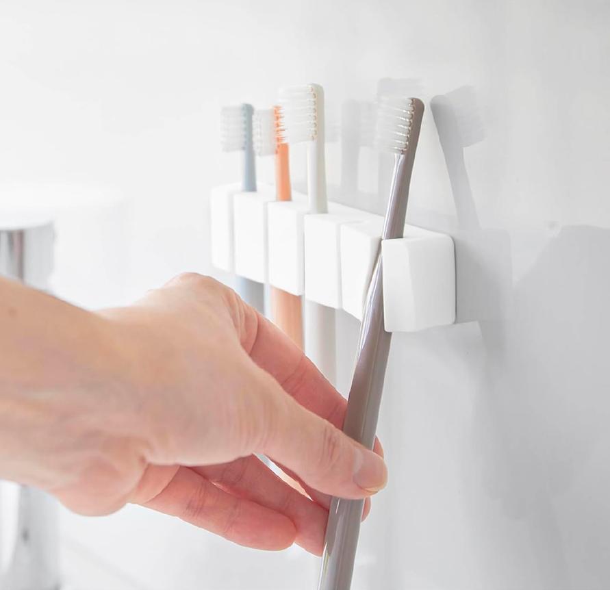 歯ブラシを壁面収納できるシリコーン製の5連ホルダーで、洗面所のタイルや鏡などに貼り付けて使用するアイテム。