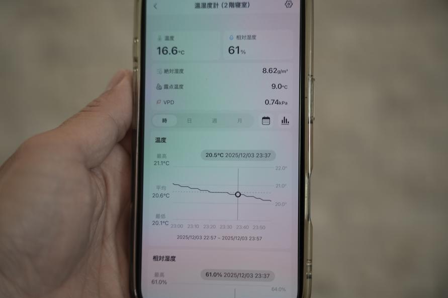 この温湿度計はポータブルなので、加湿器から離れた実際に人がいるところの近く、たとえばデスクの上やベッドサイドに置くことができ、部屋のリアルな湿度が分かります。