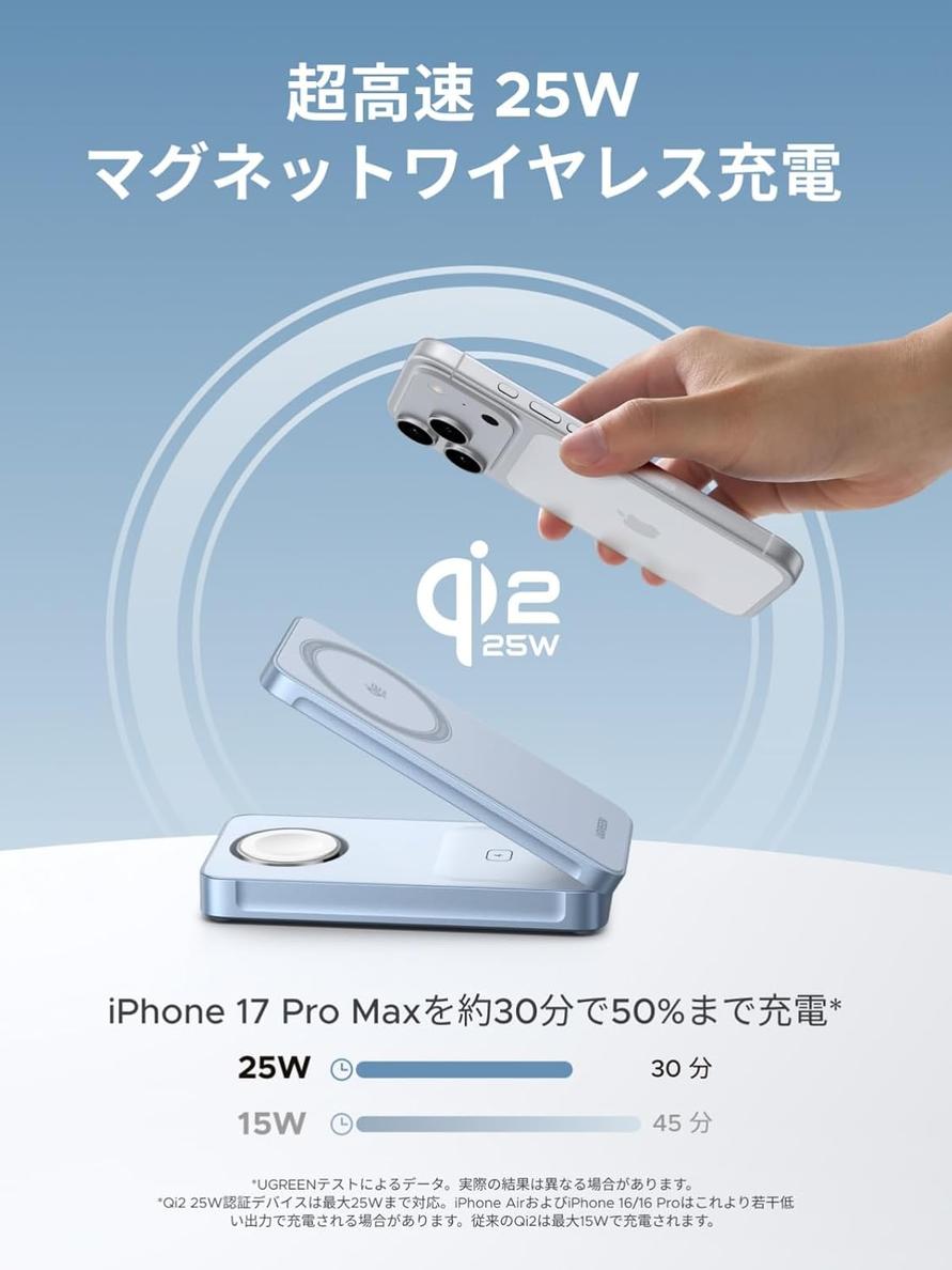 本日2025年12月4日は、従来のワイヤレス充電にありがちな「遅い」「ズレる」を解消し、iPhone 17 Pro Maxを約30分で50%まで充電できるなど、MagSafe対応iPhoneを最速クラスで充電してくれる、UGREEN(ユーグリーン)の「MagFlow 3-in-1 マグネット式ワイヤレス充電器 25W」がお得に登場しています。