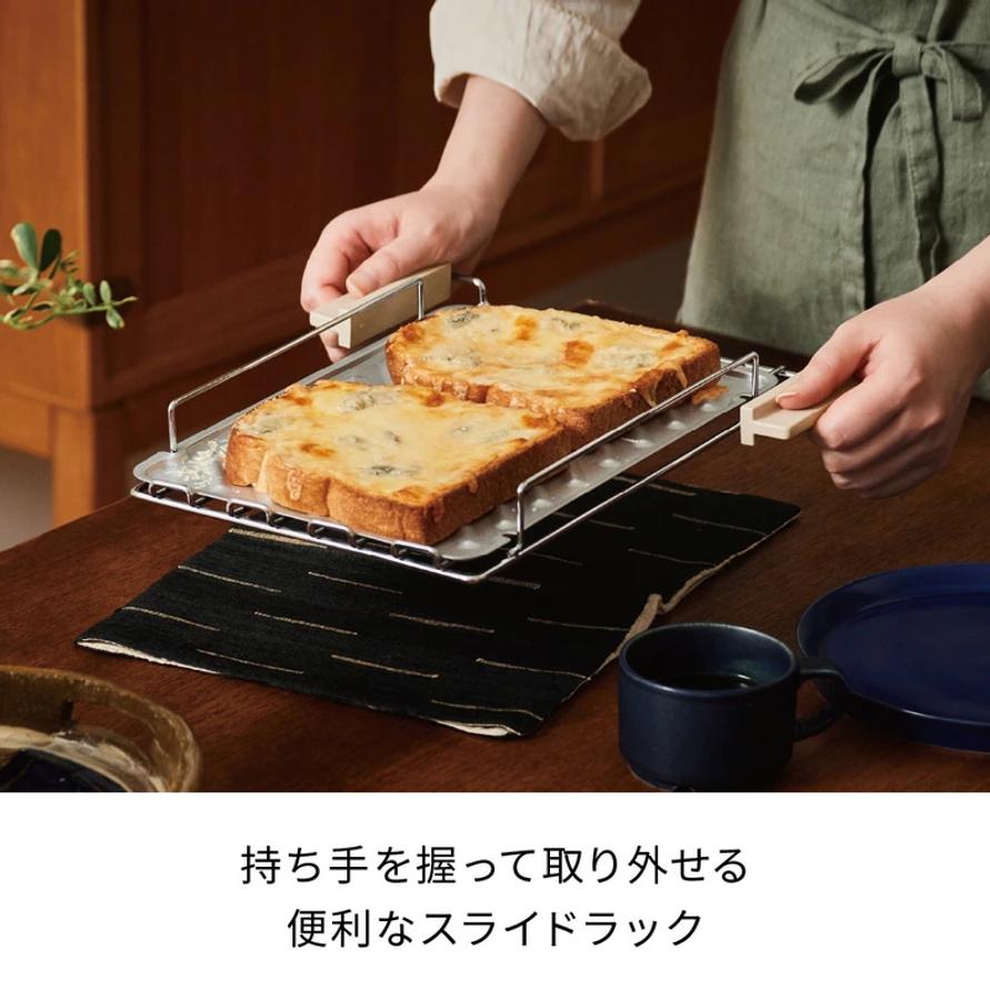 加えて、このモデル最大の発明がラックごと取り外せるスライドラック構造。取っ手は熱くなりにくく、焼きたてのパンをそのままダイニングへ運べます。皿に移す手間も、熱々に触れてしまう心配もなし。キッチンと食卓の移動までを含めて設計された、まさに“暮らしファースト”な1台です