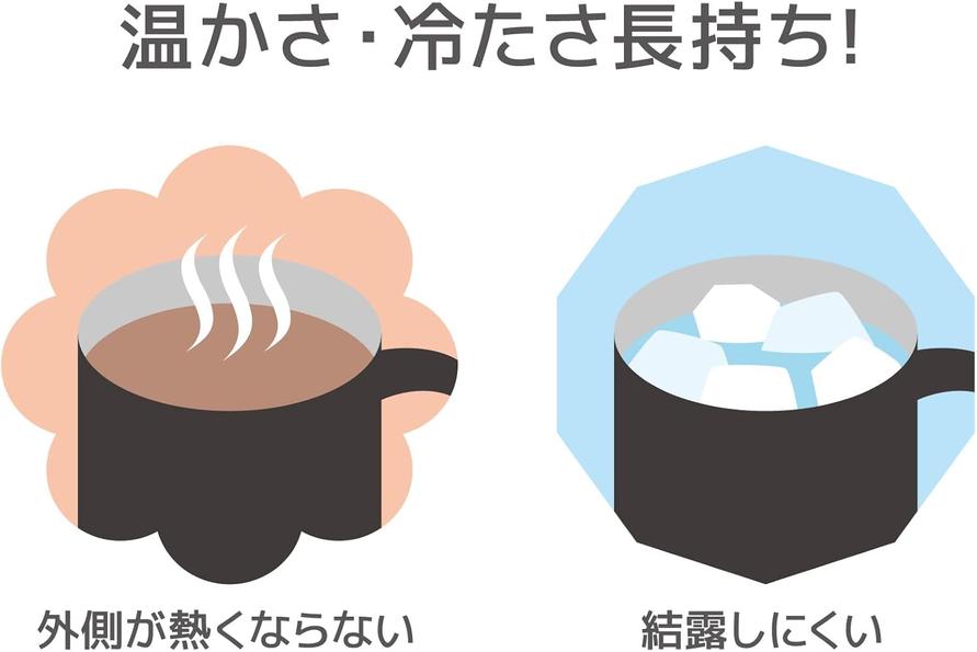 ステンレス製の魔法びん構造により、温かい飲み物も冷たい飲み物も飲み頃の温度を長時間キープしてくれますよ。