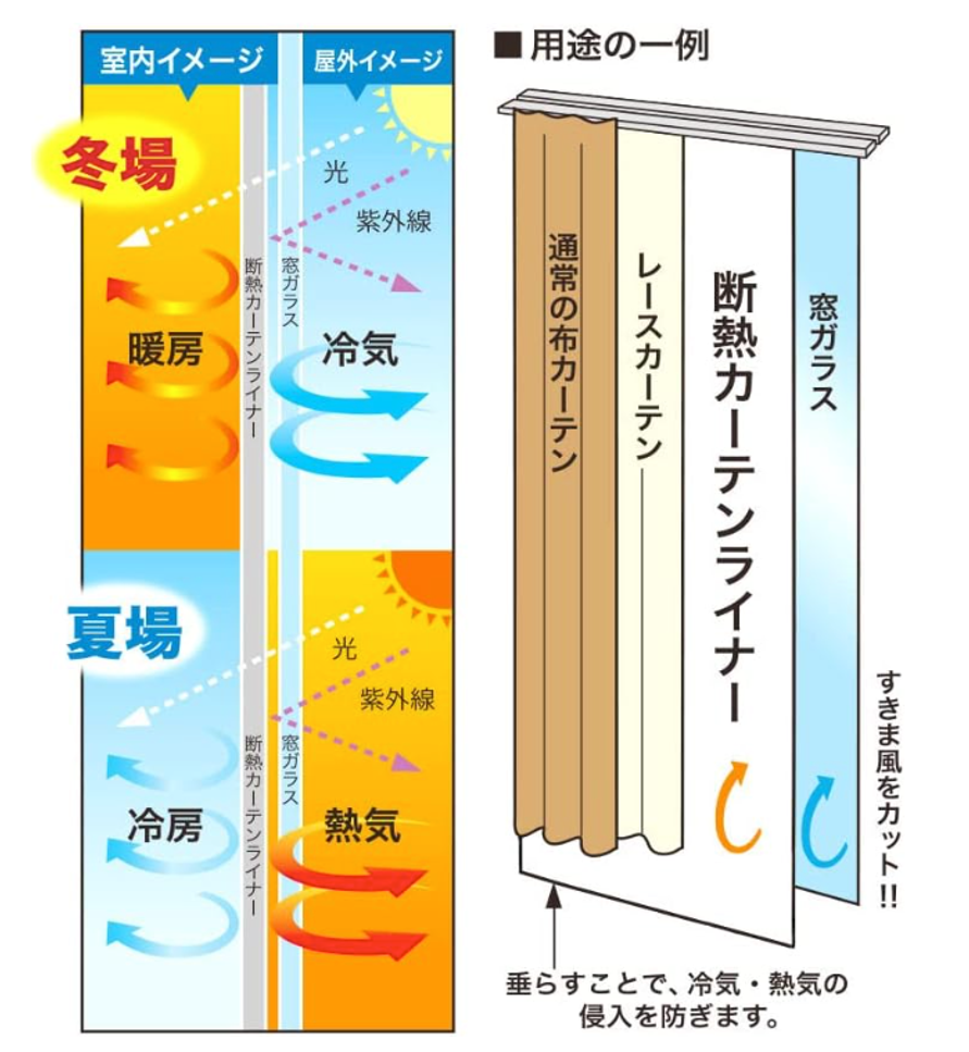 窓とカーテンの間に断熱の層を作ることで、冬は冷気の侵入を防ぎ、夏は外からの熱や紫外線を遮断します。