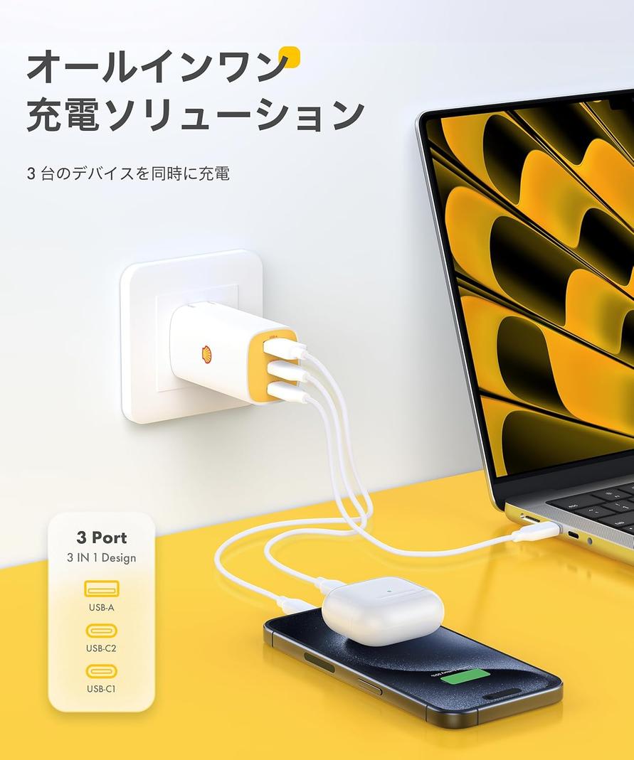最大65W出力のType-Cポート2つとUSB-Aポート1つを搭載。ノートPCからスマホ、タブレットまで、これ1台でまとめて急速充電できます。最大3台同時充電に対応しているため、コンセントの取り合いとも無縁です。