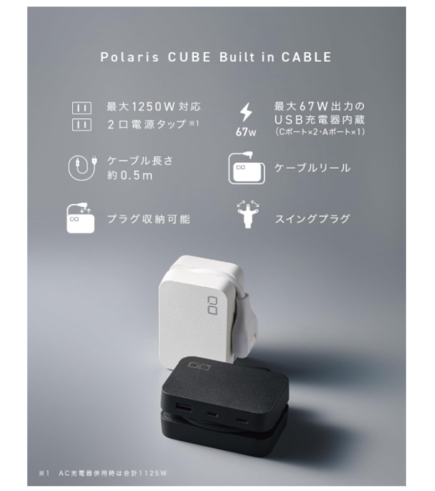 CIOの「Polaris CUBE Built in CABLE」は、AC100V電源タップ2口、USB-Cを2ポート・USB-Aを1ポート搭載し、5台までさまざまなデバイスを同時充電できる延長コード付き電源タップです。今なら25%オフとお得に購入できるチャンス!