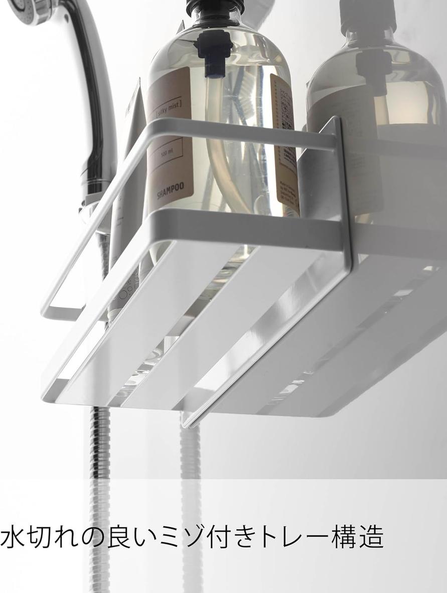 トレーには水切れの良いミゾ設計を採用。使用後の水滴がたまりにくく、ヌメリや水アカの発生を抑えてくれます。結果的に、ラック自体も浴室全体も清潔にキープしやすい設計です。