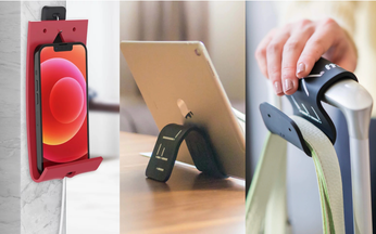 ぐにゃっと折り曲げられるスマホスタンド。形を自由に変えられるから、いろんなところに置けるよ