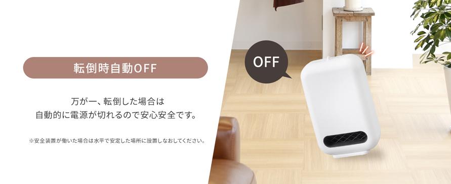 地震が起きたり、子どもやペットがぶつかったりして、万が一本体が転倒した場合は、自動的に電源が切れる「転倒時自動OF機能」も搭載。