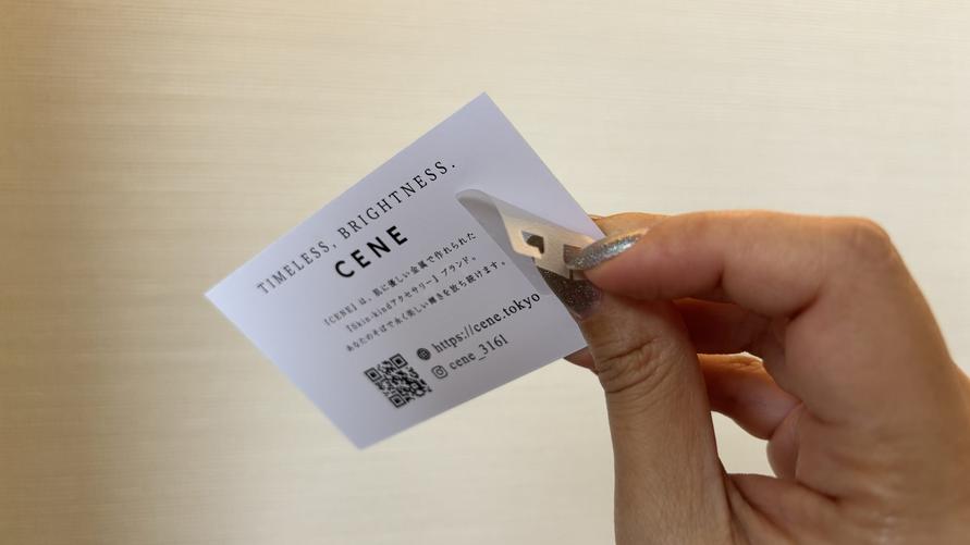 シンプルな使い心地もいい感じ。粘着面を名刺やカード、チケットなどの端にペタッと貼り付けるだけです。