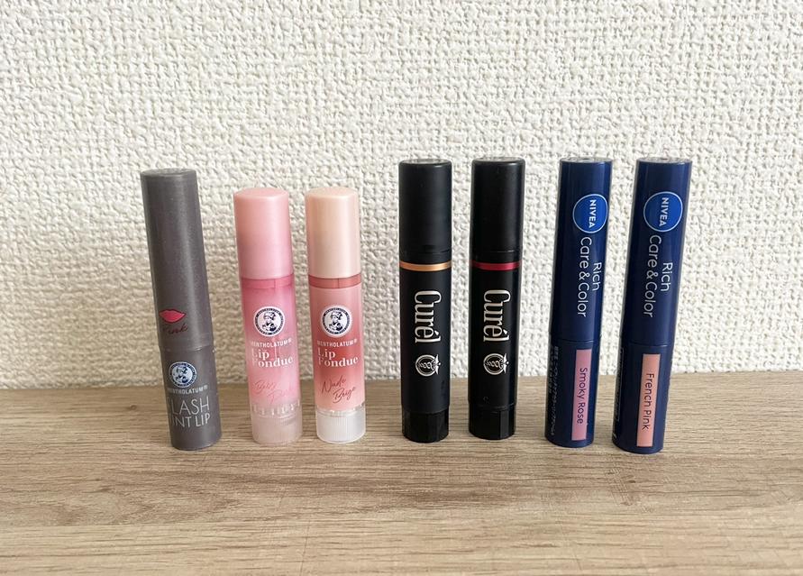 左から順に、メンソレータムの「フラッシュティントリップ」、同じくメンソレータムの「リップフォンデュ」2種類、キュレルの「リップケア クリーム」2種類、ニベアの「リッチケア&カラーリップ」です。