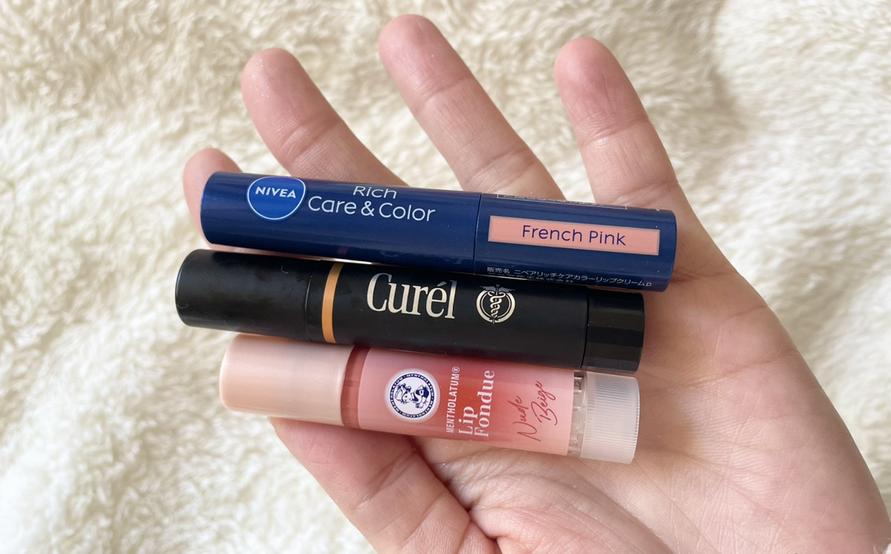 キュレルの「リップケア クリーム」を下地として忍ばせ、ニベアの「リッチケア&カラーリップ」で色をのせる。そこにメンソレータムの「リップフォンデュ」で艶を足す……といった具合に3つ使いを楽しんでいます。