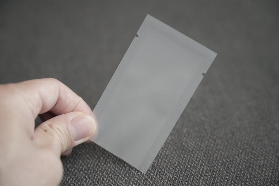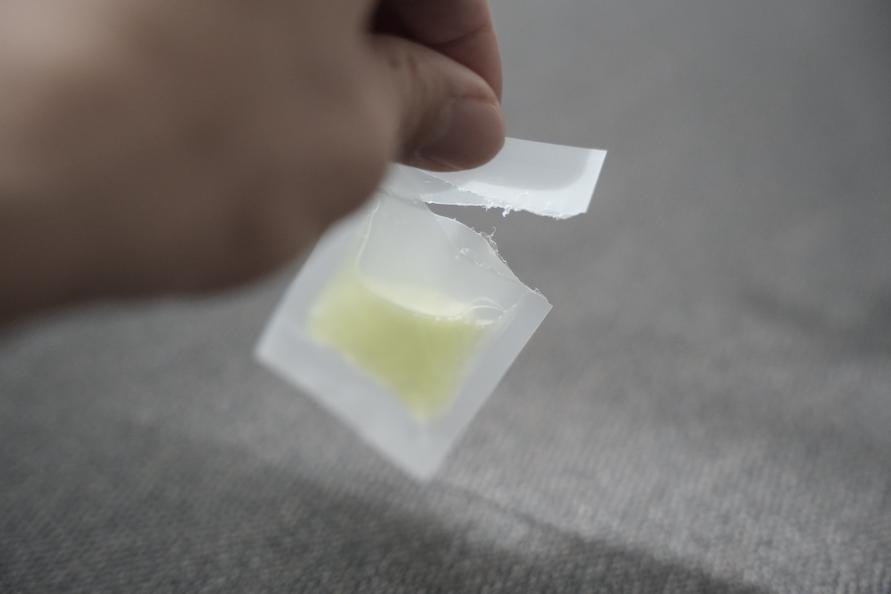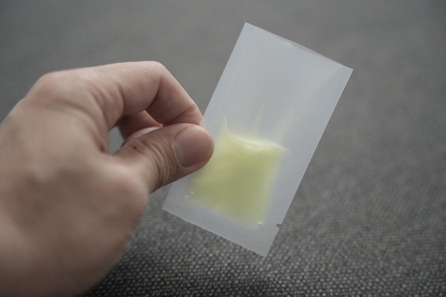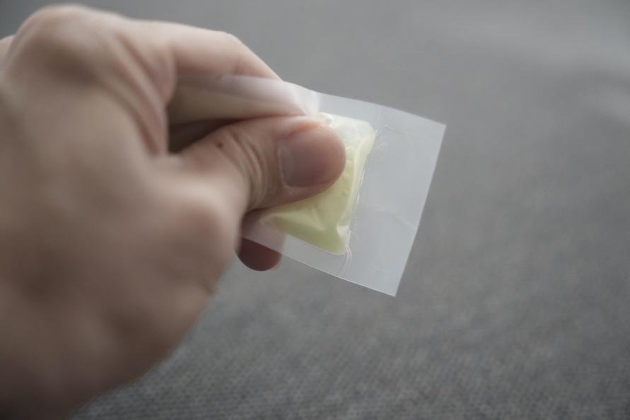 このパウチは底の辺は閉じられておらず、袋の中に液体を入れられるような作りになっていて。