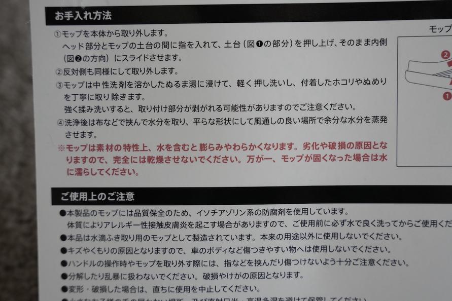 先ほど少し書きましたが、このモップは少し湿らせた状態にしておくのがよく、完全に乾かすのはNGとのこと。