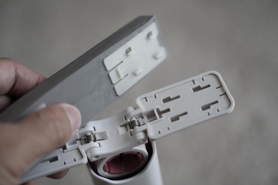 これを本体部分に取り付けるのですが、写真の左下に写っている赤いリングを押し下げると、モップを取り付ける部分が繰り出てきます。