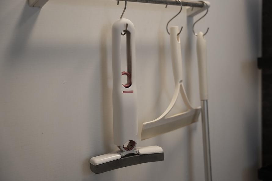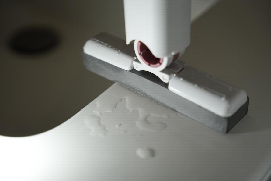 拭き取った後は、軽く流水で洗い、先ほどの赤いレバーを引き上げるとモップ部分が折りたたまれ、そのまま水切りができちゃうんです!