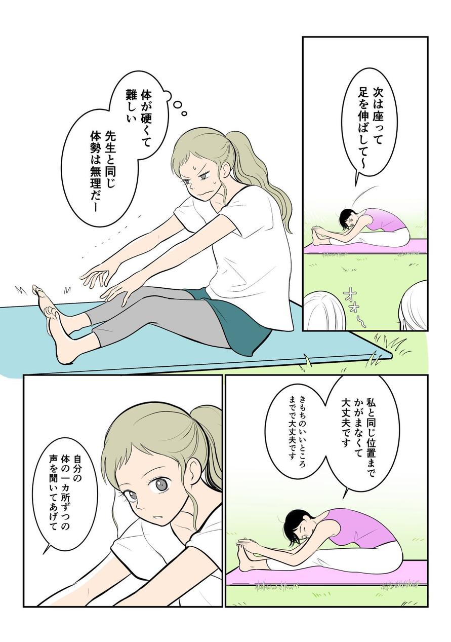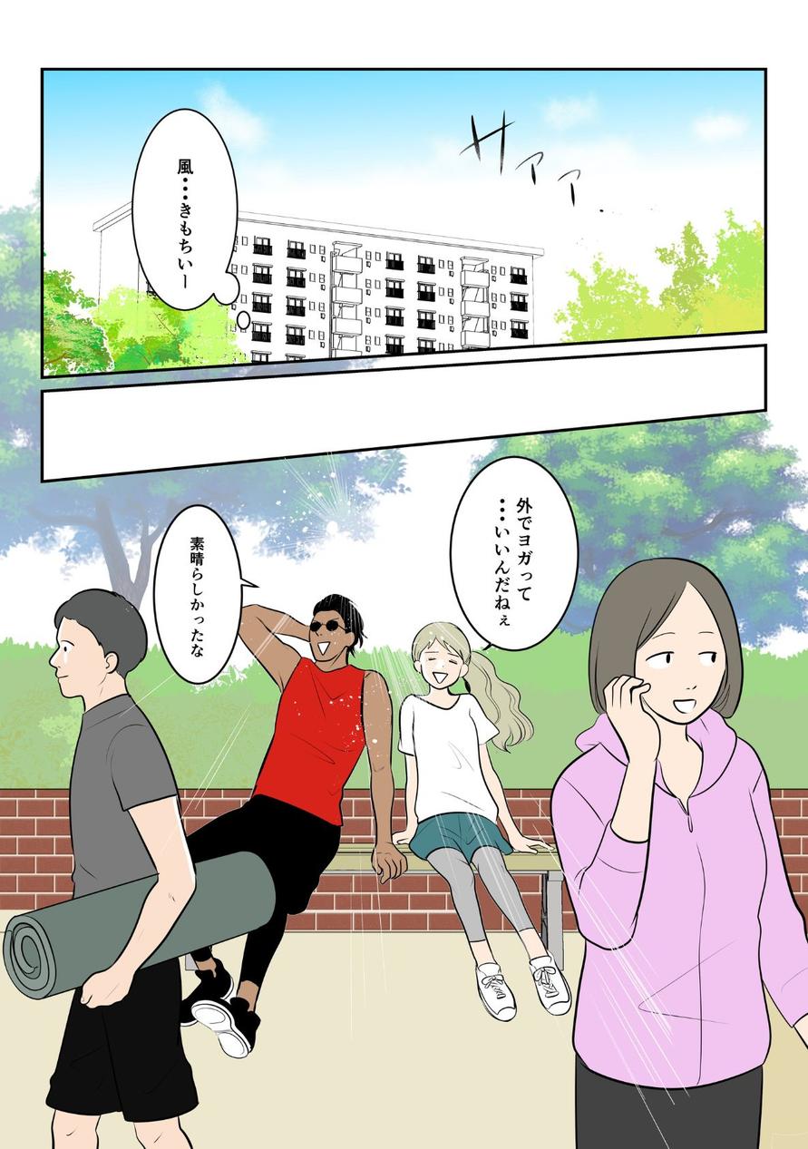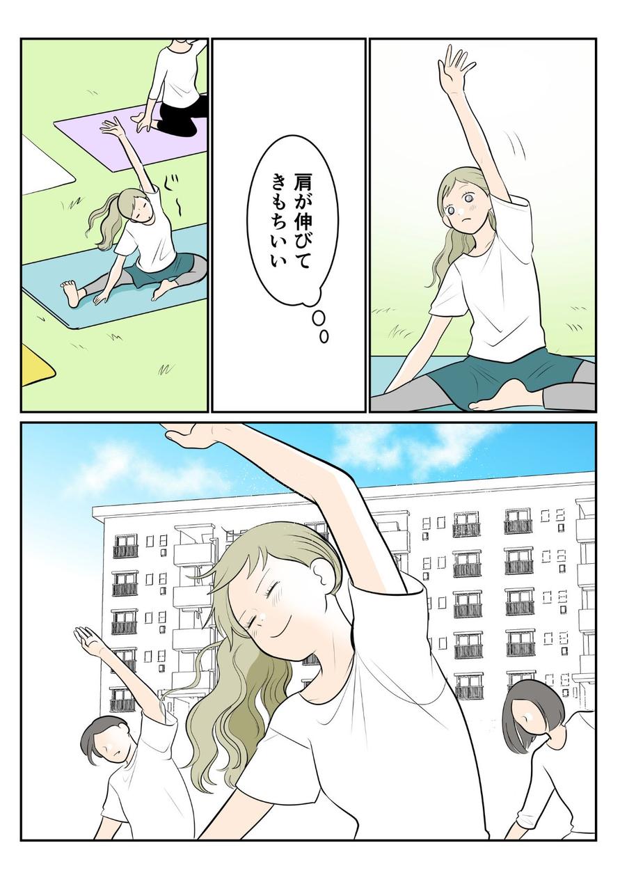 団地の広場で開催された「青空ヨガ」に参加したサチとジョー太郎。そよぐ風を感じながら、サチはきもちよさを実感しました。